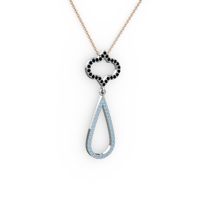 Siyah zirkon ve akuamarin 8 ayar beyaz altın kolye (40 cm rose altın rolo zincir)