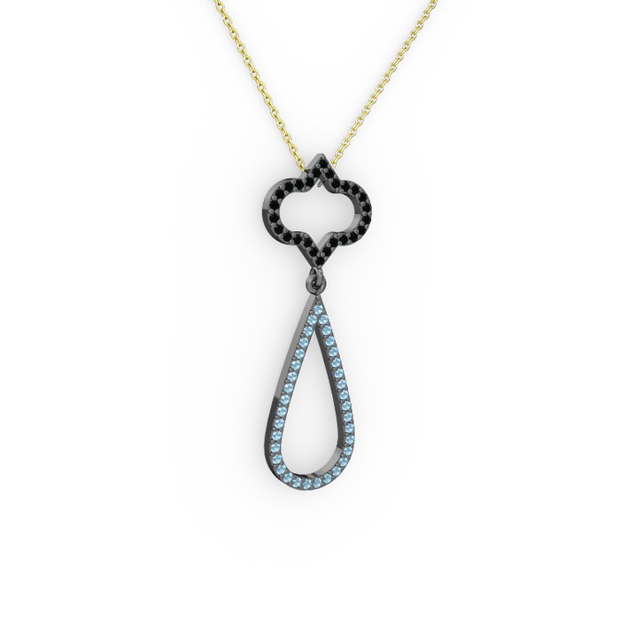 Siyah zirkon ve akuamarin 925 ayar siyah rodyum kaplama gümüş kolye (40 cm altın rolo zincir)