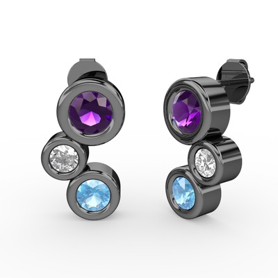 Akuamarin, ametist ve pırlanta 925 ayar siyah rodyum kaplama gümüş küpe (0.48 karat)