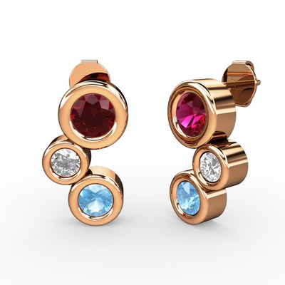 Akuamarin, rodolit garnet ve beyaz zirkon 14 ayar rose altın küpe
