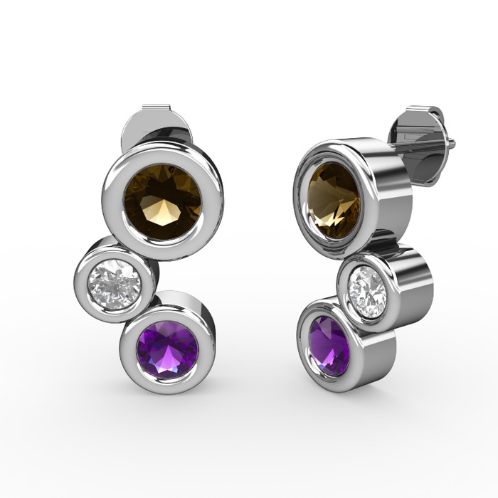 Ametist, dumanlı kuvars ve beyaz zirkon 14 ayar beyaz altın küpe