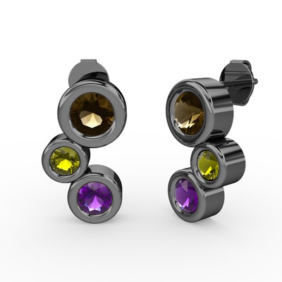 Ametist, dumanlı kuvars ve peridot 925 ayar siyah rodyum kaplama gümüş küpe