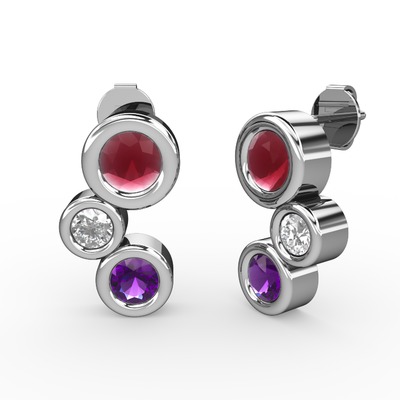 Ametist, kök yakut ve beyaz zirkon 8 ayar beyaz altın küpe