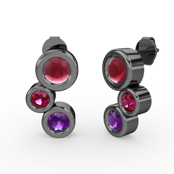 Ametist, kök yakut ve rodolit garnet 925 ayar siyah rodyum kaplama gümüş küpe