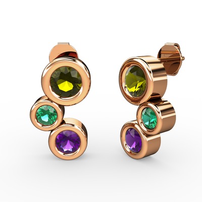 Ametist, peridot ve yeşil kuvars 14 ayar rose altın küpe