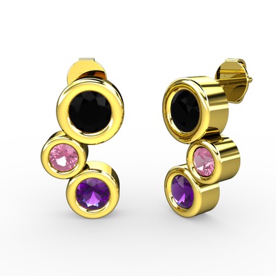 Ametist, siyah zirkon ve pembe kuvars 8 ayar altın küpe