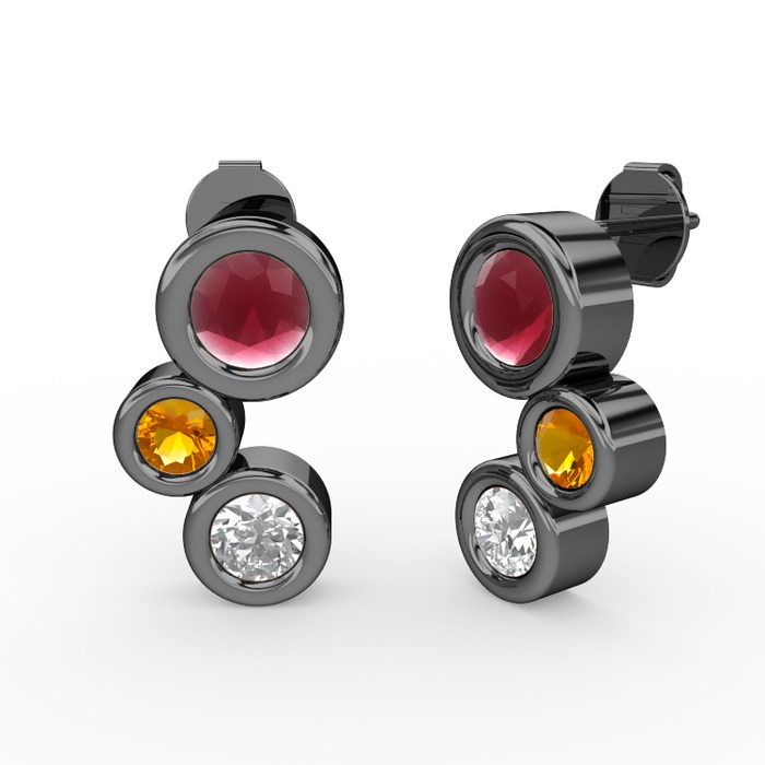 Beyaz zirkon, kök yakut ve sitrin 925 ayar siyah rodyum kaplama gümüş küpe