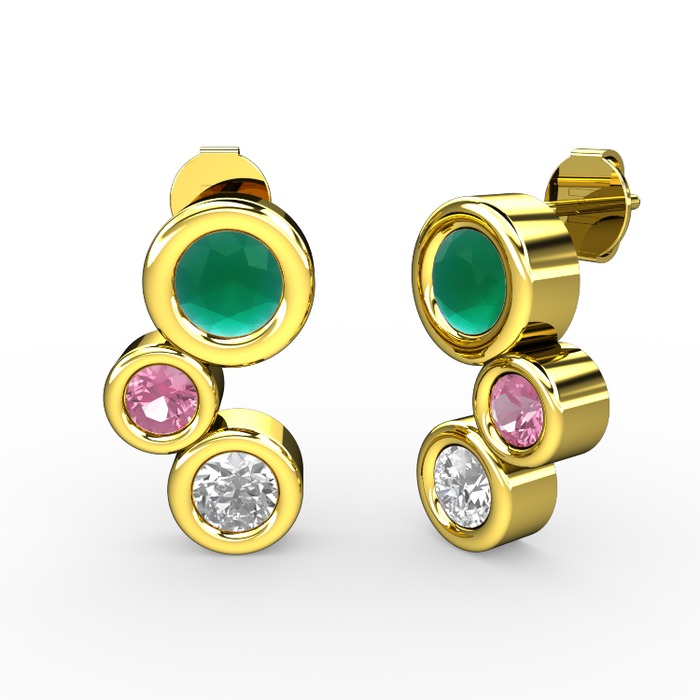 Beyaz zirkon, kök zümrüt ve pembe kuvars 925 ayar altın kaplama gümüş küpe