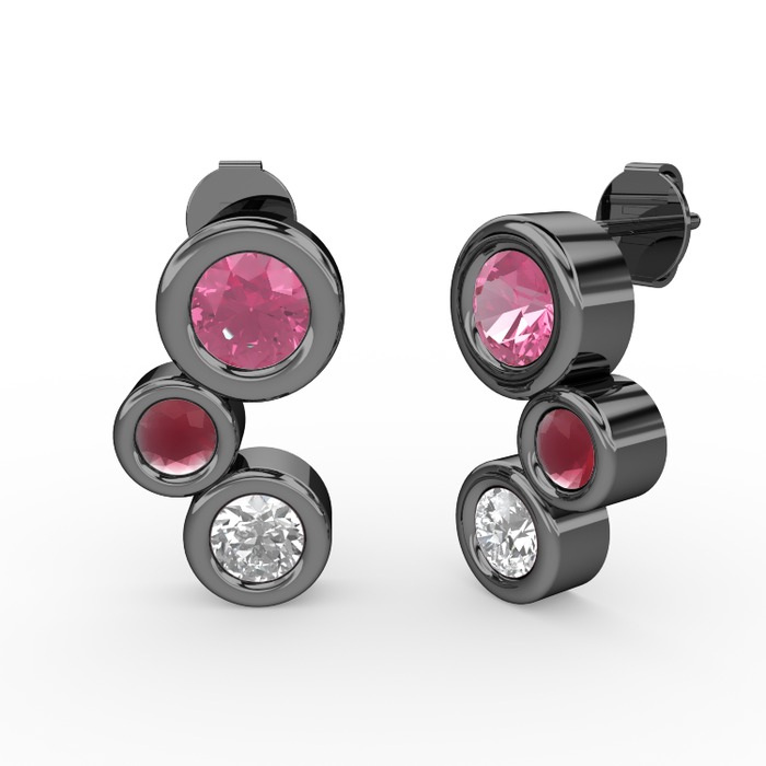 Beyaz zirkon, pembe kuvars ve kök yakut 925 ayar siyah rodyum kaplama gümüş küpe