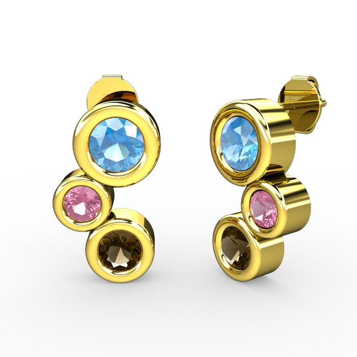 Dumanlı kuvars, akuamarin ve pembe kuvars 925 ayar altın kaplama gümüş küpe