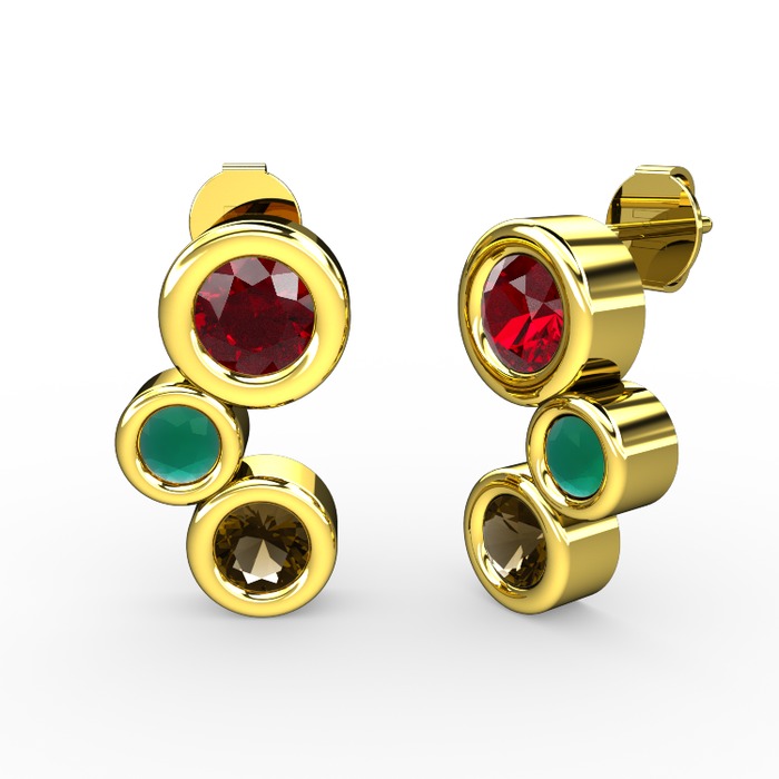 Dumanlı kuvars, garnet ve kök zümrüt 18 ayar altın küpe
