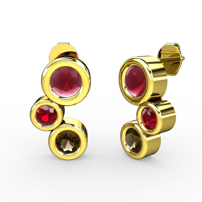 Dumanlı kuvars, kök yakut ve garnet 18 ayar altın küpe