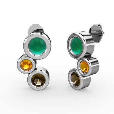 Dumanlı kuvars, kök zümrüt ve sitrin 14 ayar beyaz altın küpe