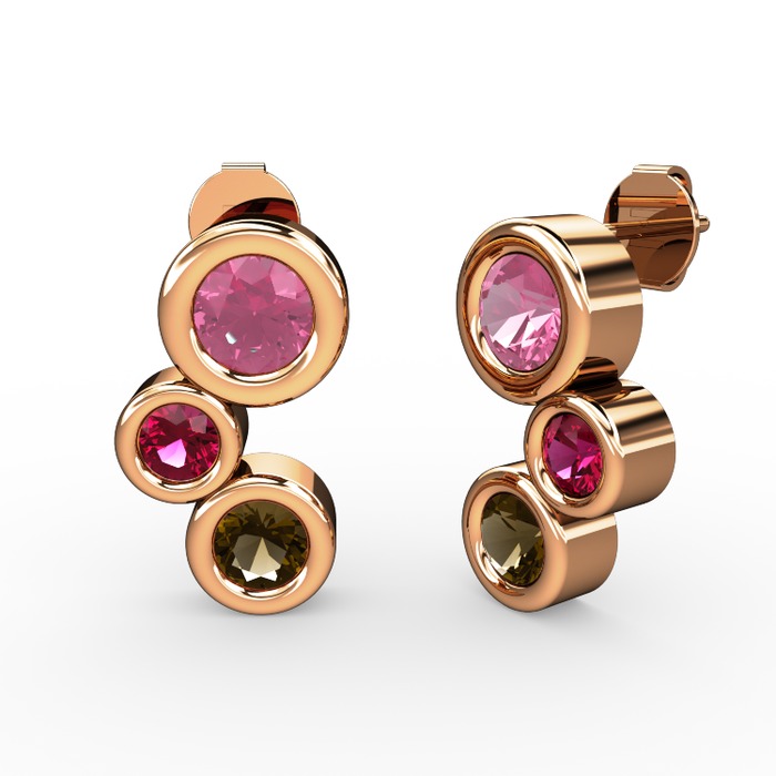 Dumanlı kuvars, pembe kuvars ve rodolit garnet 14 ayar rose altın küpe