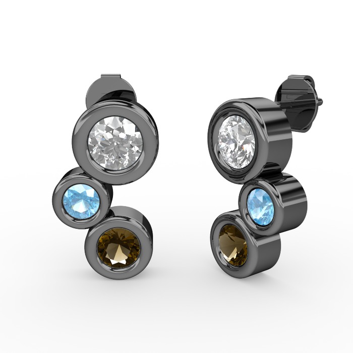 Dumanlı kuvars, pırlanta ve akuamarin 925 ayar siyah rodyum kaplama gümüş küpe (1.84 karat)