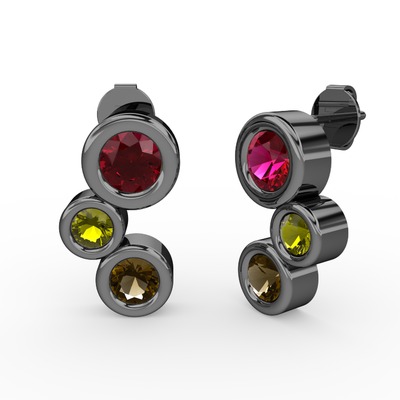 Dumanlı kuvars, rodolit garnet ve peridot 925 ayar siyah rodyum kaplama gümüş küpe