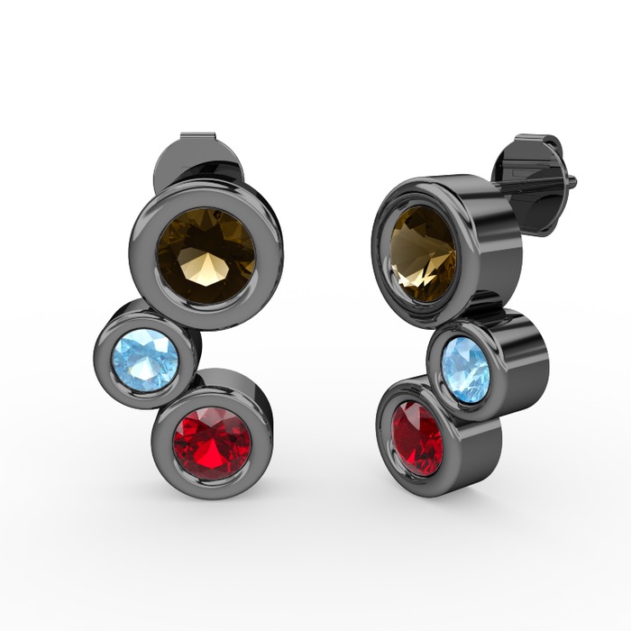Garnet, dumanlı kuvars ve akuamarin 925 ayar siyah rodyum kaplama gümüş küpe