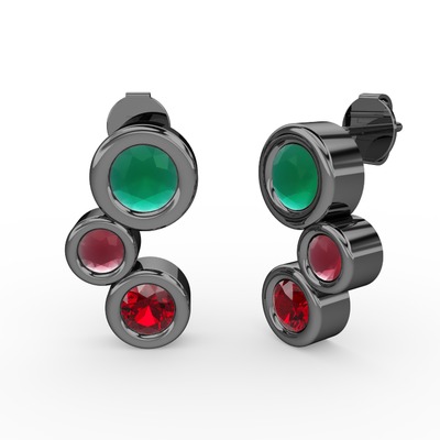 Garnet, kök zümrüt ve kök yakut 925 ayar siyah rodyum kaplama gümüş küpe