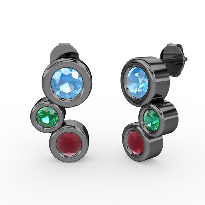 Kök yakut, akuamarin ve yeşil kuvars 925 ayar siyah rodyum kaplama gümüş küpe
