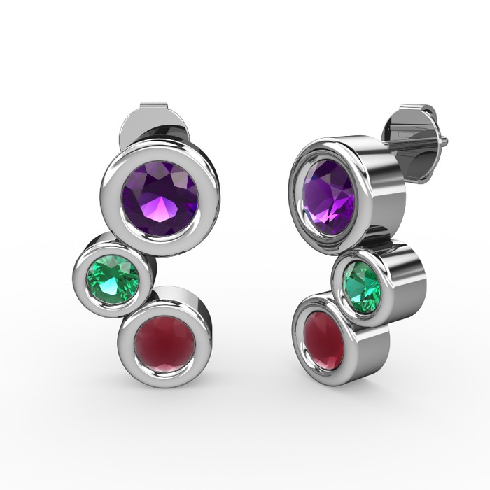 Kök yakut, ametist ve yeşil kuvars 8 ayar beyaz altın küpe