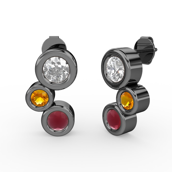 Kök yakut, beyaz zirkon ve sitrin 925 ayar siyah rodyum kaplama gümüş küpe