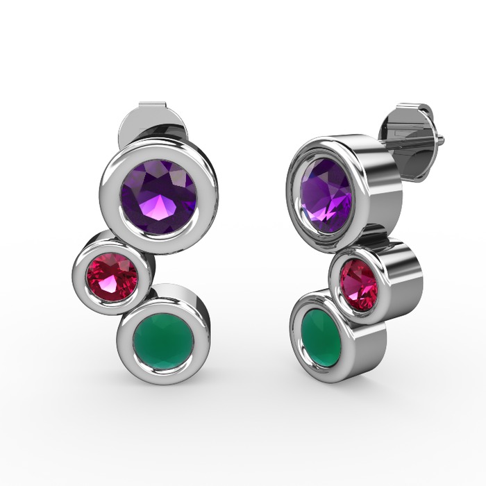 Kök zümrüt, ametist ve rodolit garnet 18 ayar beyaz altın küpe