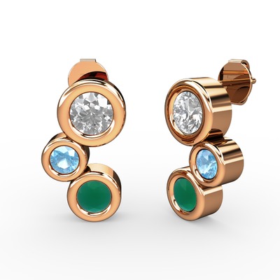 Kök zümrüt, beyaz zirkon ve akuamarin 18 ayar rose altın küpe