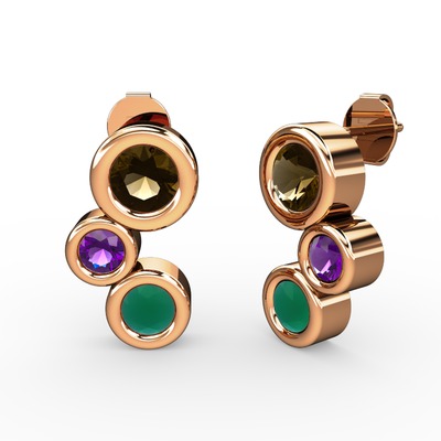 Kök zümrüt, dumanlı kuvars ve ametist 18 ayar rose altın küpe