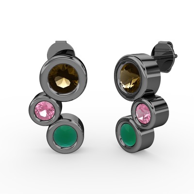 Kök zümrüt, dumanlı kuvars ve pembe kuvars 925 ayar siyah rodyum kaplama gümüş küpe