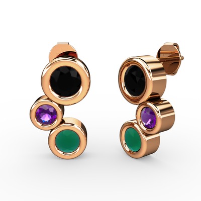 Kök zümrüt, siyah zirkon ve ametist 18 ayar rose altın küpe