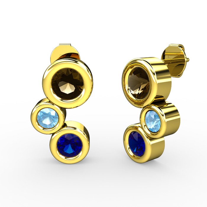 Lab safir, dumanlı kuvars ve akuamarin 925 ayar altın kaplama gümüş küpe