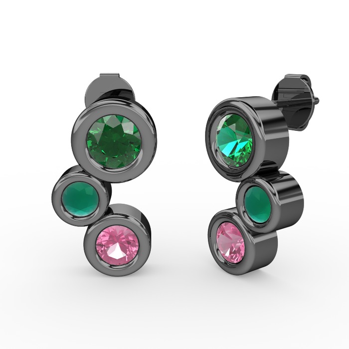 Pembe kuvars, yeşil kuvars ve kök zümrüt 925 ayar siyah rodyum kaplama gümüş küpe