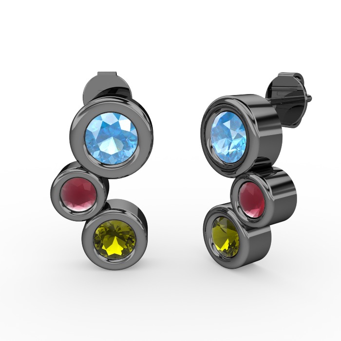 Peridot, akuamarin ve kök yakut 925 ayar siyah rodyum kaplama gümüş küpe