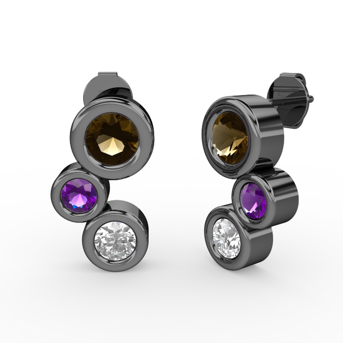 Pırlanta, dumanlı kuvars ve ametist 925 ayar siyah rodyum kaplama gümüş küpe (1 karat)