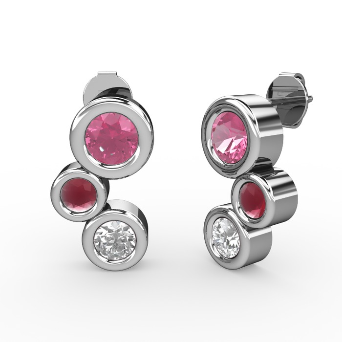 Pırlanta, pembe kuvars ve kök yakut 8 ayar beyaz altın küpe (1 karat)