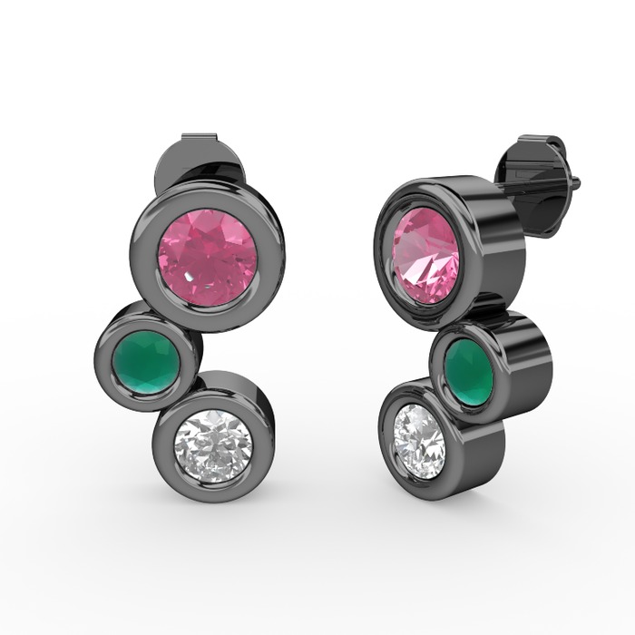 Pırlanta, pembe kuvars ve kök zümrüt 925 ayar siyah rodyum kaplama gümüş küpe (1 karat)