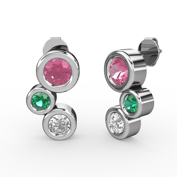 Pırlanta, pembe kuvars ve yeşil kuvars 18 ayar beyaz altın küpe (1 karat)
