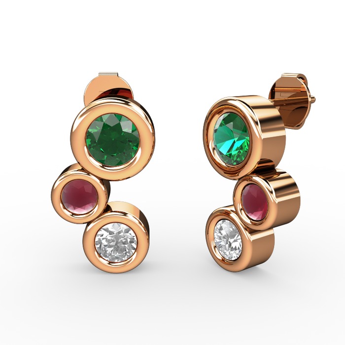 Pırlanta, yeşil kuvars ve kök yakut 925 ayar rose altın kaplama gümüş küpe (1 karat)