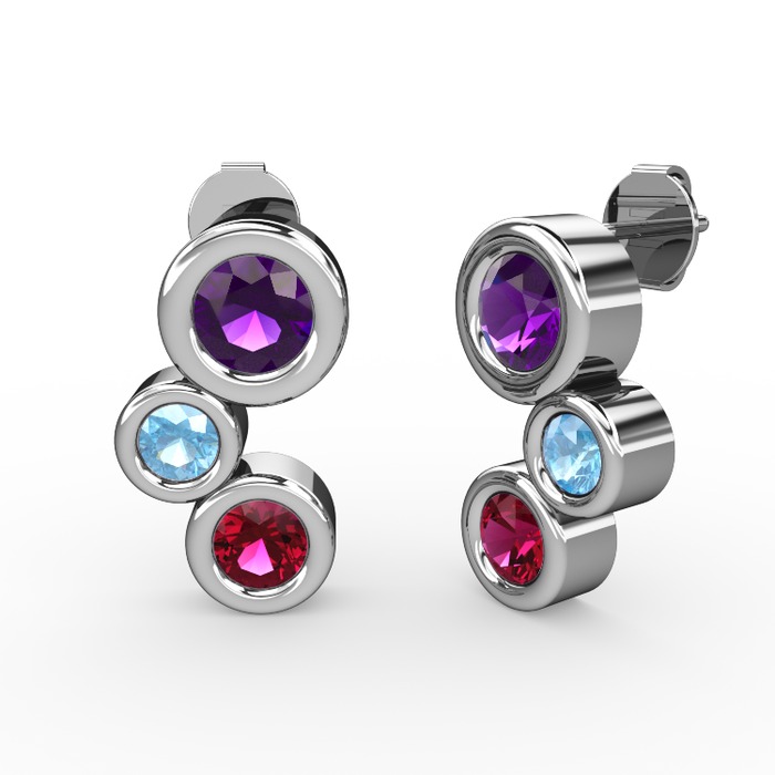 Rodolit garnet, ametist ve akuamarin 14 ayar beyaz altın küpe