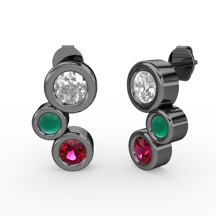 Rodolit garnet, beyaz zirkon ve kök zümrüt 925 ayar siyah rodyum kaplama gümüş küpe