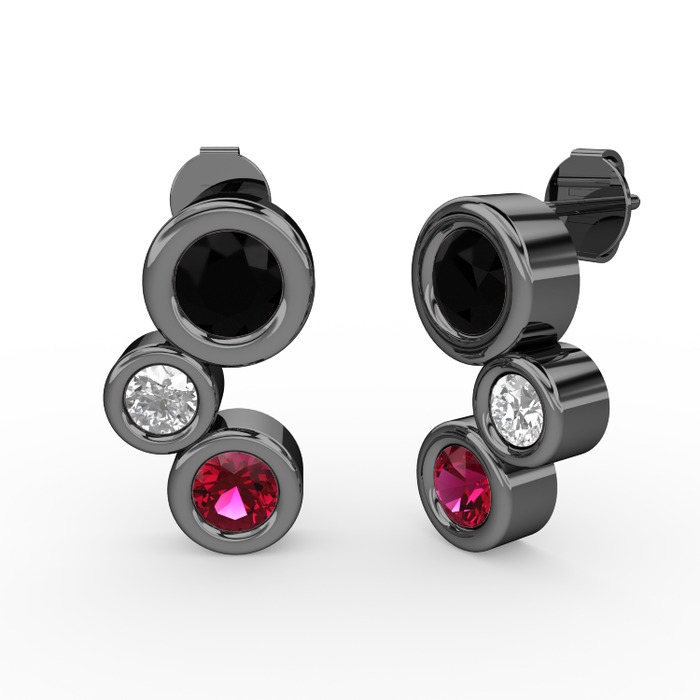 Rodolit garnet, siyah zirkon ve pırlanta 925 ayar siyah rodyum kaplama gümüş küpe (0.48 karat)