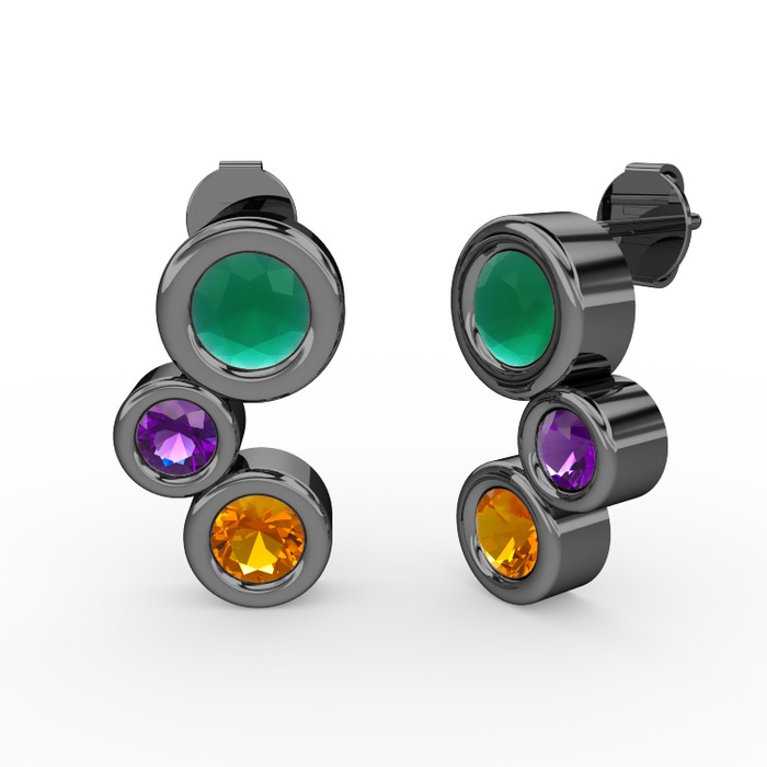 Sitrin, kök zümrüt ve ametist 925 ayar siyah rodyum kaplama gümüş küpe