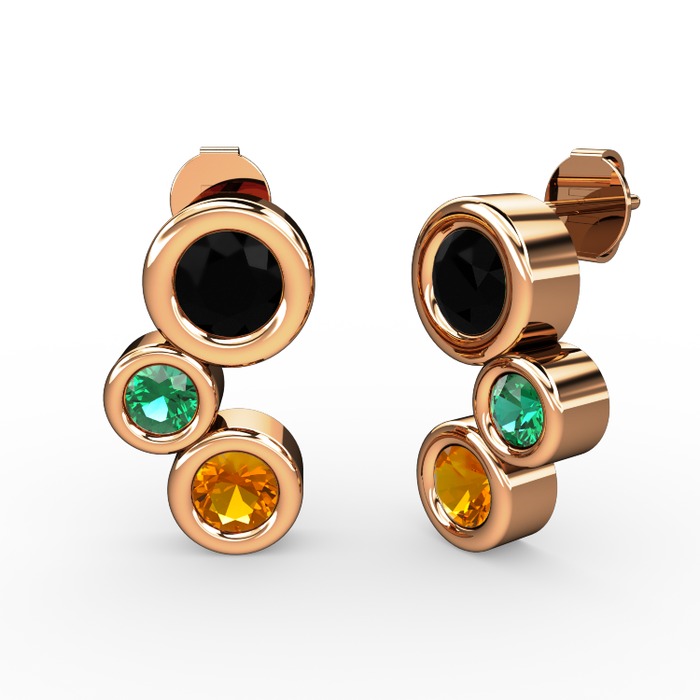 Sitrin, siyah zirkon ve yeşil kuvars 14 ayar rose altın küpe