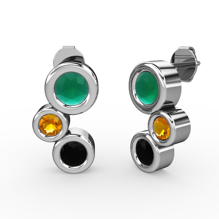 Siyah zirkon, kök zümrüt ve sitrin 18 ayar beyaz altın küpe