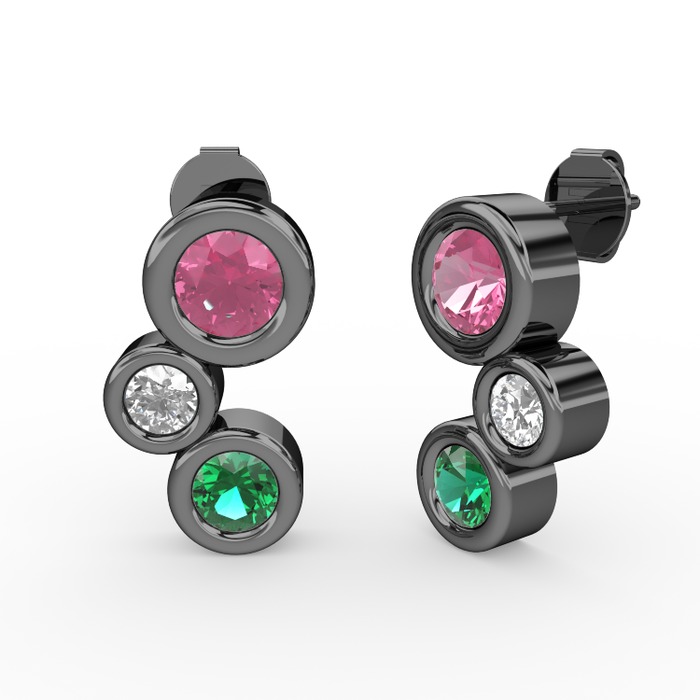 Yeşil kuvars, pembe kuvars ve pırlanta 925 ayar siyah rodyum kaplama gümüş küpe (0.48 karat)