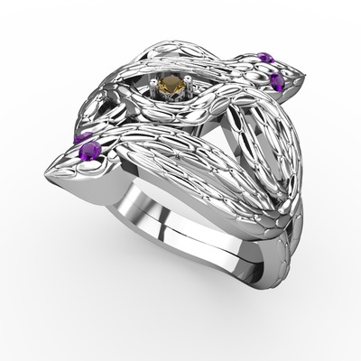 Dumanlı kuvars ve ametist 18 ayar beyaz altın yüzük