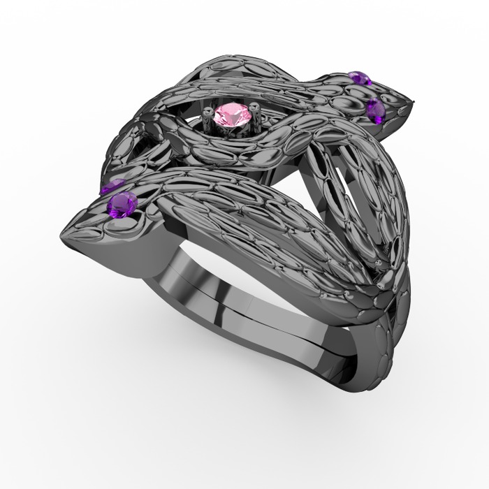 Pembe kuvars ve ametist 925 ayar siyah rodyum kaplama gümüş yüzük