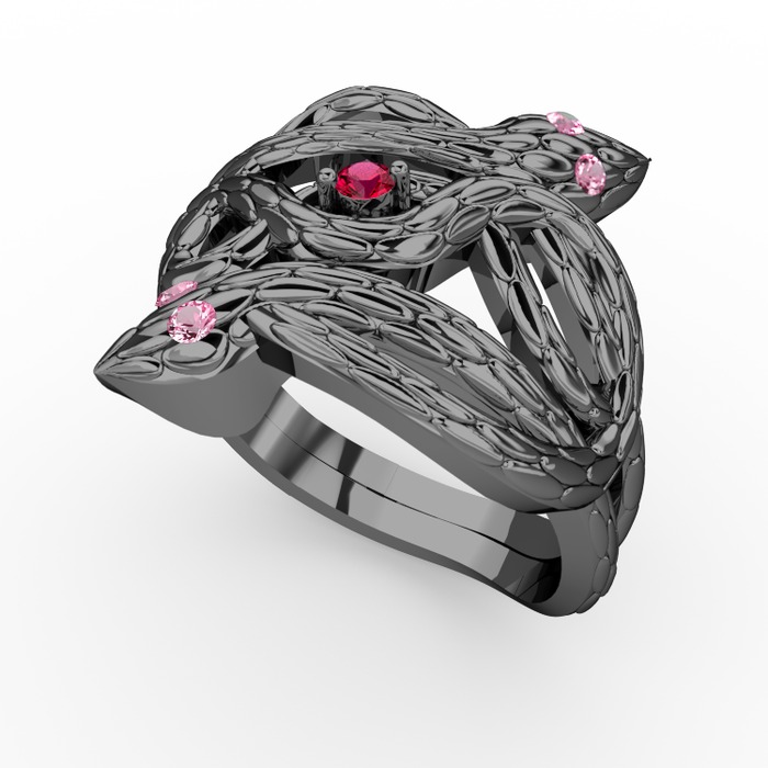 Rodolit garnet ve pembe kuvars 925 ayar siyah rodyum kaplama gümüş yüzük