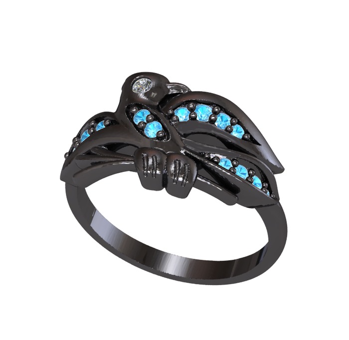 Pırlanta ve akuamarin 925 ayar siyah rodyum kaplama gümüş yüzük (0.02 karat)