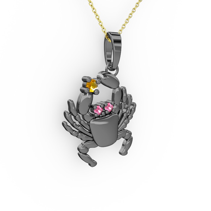 Sitrin ve pembe kuvars 925 ayar siyah rodyum kaplama gümüş kolye (40 cm altın rolo zincir)